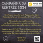 A APEB-FR dá boas vindas a tod@s nesse ano novo escolar !!! Que seja na graduação, na pós ou apenas voltando das merecidas férias de verão, desejamos a tod@s um ano cheio de sucesso, alegria e muitos encontros. A nossa associação traz muitas novidades para o segundo semestre do ano e, no ritmo de celebração da rentrée 2024, anunciamos dois eventos já no mês de setembro e uma grande campanha de associação, onde contamos com a ajuda de tod@s noss@s associad@s para espalhar nossa mensagem. Confiram abaixo nossas novidades para setembro: Diretoria da APEB-FR 2024 – Leia Mais / En savoir plus –