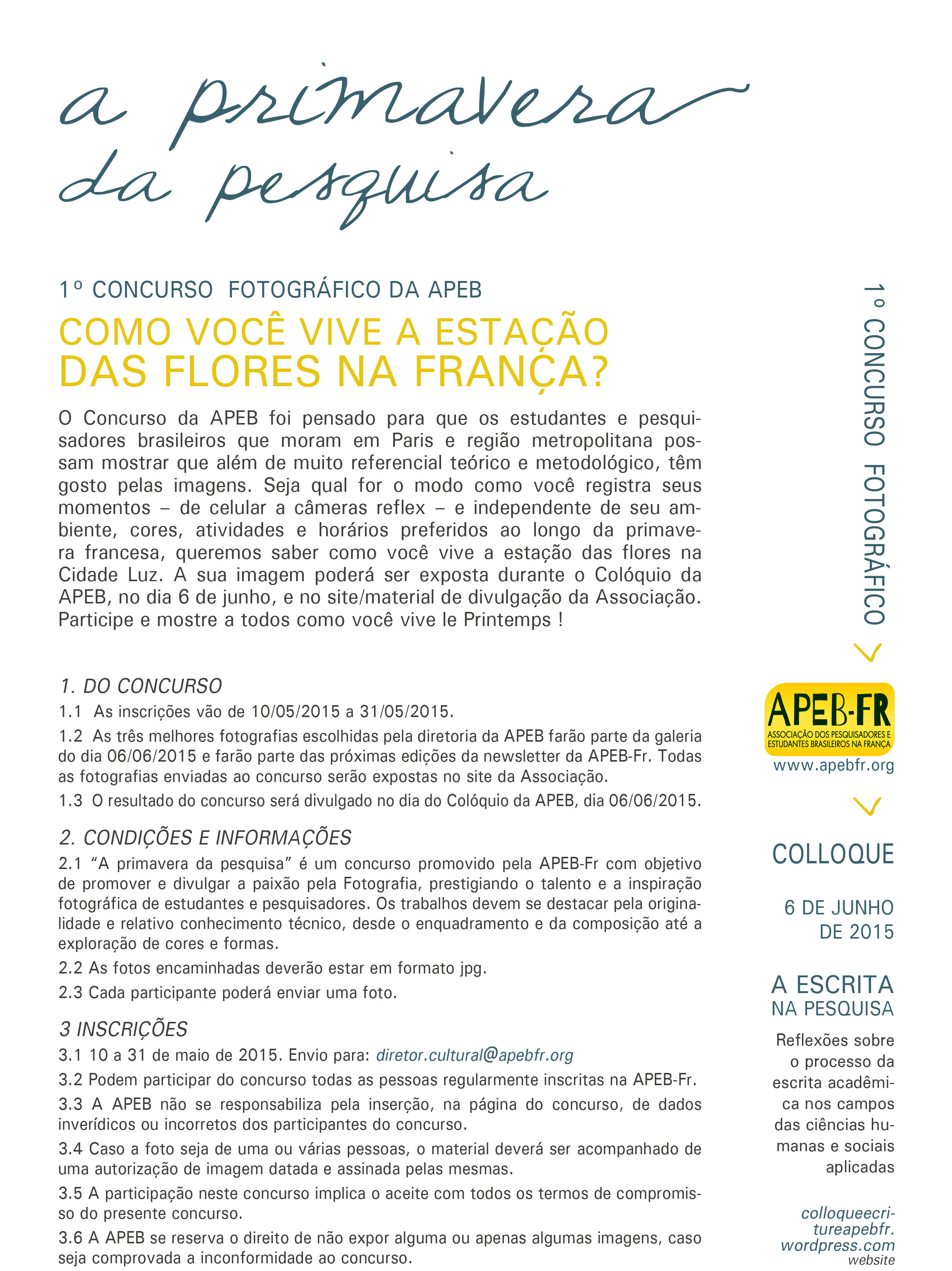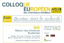Caros associados, A data final para a submissão de proposições de comunicação foi prorrogada para o dia 10 de maio de 2015 (domingo). Colóquio temático da APEB-Fr 06/06/2015 – Paris A ESCRITA NA PESQUISA Reflexões sobre o processo da escrita acadêmica nos campos das Ciências Humanas e Sociais Aplicadas No sábado 06 de junho de 2015, a APEB-Fr realizará mais um colóquio temático. Este evento dá continuidade aos encontros acadêmicos, desenvolvidos em torno de uma temática, realizados nos últimos anos, como a Journée LGBT (2012), os colóquios 90 ans du Modernisme (2012) e Penser la ville aujourd’hui dans la littérature et les arts (2013). A escrita na pesquisa é um encontro que visa a discutir, a partir de uma perspectiva epistemológica e pluridisciplinar, uma das etapas fundamentais das pesquisas nas áreas das Ciências Humanas e Sociais Aplicadas: a escrita. Procuraremos discutir este tema de maneira (auto)crítica e implicada, de modo a refletir sobre o processo de produção de nossas pesquisas. « Il n’était pas assujetti à ce qu’il venait de vivre, mais ce qu’il venait de vivre était assujetti à ce qu’il avait écrit ». Milan Kundera, La vie est ailleurs, 1991. Chamada de trabalhos Aceitaremos propostas de comunicações orais, em português ou francês, que se encaixem dentro da temática do colóquio. PRORROGAÇÃO > data final de envio das proposições : 10 de maio de 2015. Para conhecer todas as modalidades de participação, acesse o blog do evento. A chamada de trabalhos também pode ser consultada aqui. Para mais informações: colloqueecriture@apebfr.org – Leia Mais / En savoir plus –