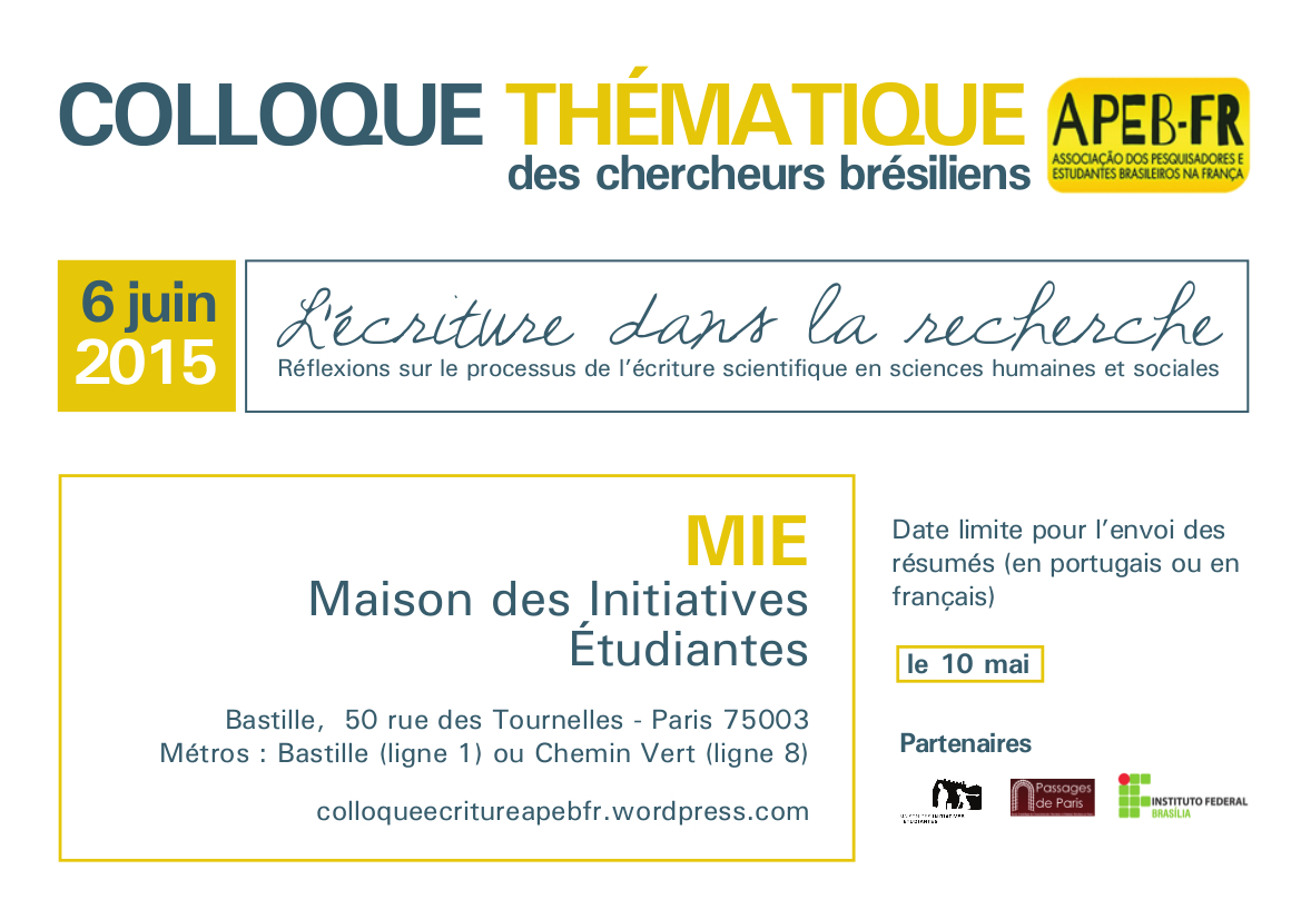 No sábado 06 de junho de 2015, a APEB-Fr realizará mais um colóquio temático. Este evento dá continuidade aos encontros acadêmicos, desenvolvidos em torno de uma temática, realizados nos últimos anos, como a Journée LGBT (2012), os colóquios 90 ans du Modernisme (2012) e Penser la ville aujourd’hui dans la littérature et les arts (2013).