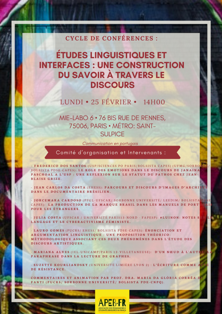 - Lauro Gomes (PUCRS/ EHESS/ bolsista PDSE-Capes): Énonciation et argumentation linguistique : une proposition théorico-méthodologique associant ces deux phénomènes dans l’étude des discours artistiques