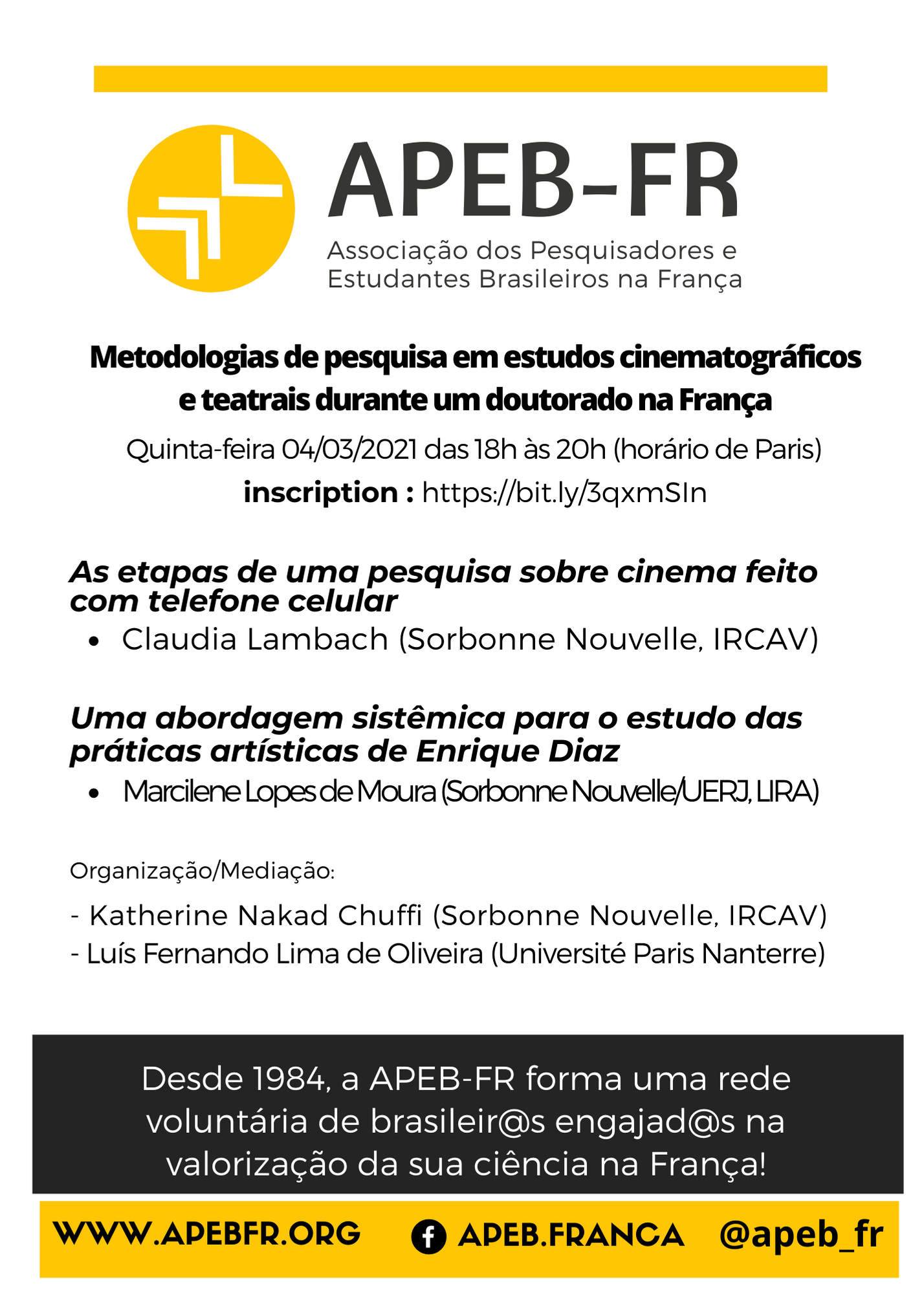 Organização/Mediação: Katherine Nakad Chuffi (Sorbonne Nouvelle, IRCAV) et Luís Fernando Lima de Oliveira (Université Paris Nanterre)
