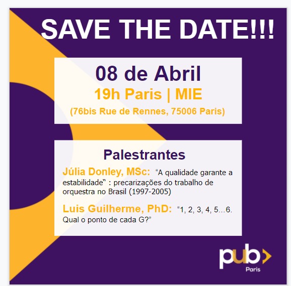 O encontro acontecerá na sexta-feira dia 8 de abril, às 19h, na MIE – Maison des Initiatives Etudiantes – 76 bis Rue de Rennes – 75006 Paris. Inscreva-se aqui: https://pubparis.fr/eventos-1.