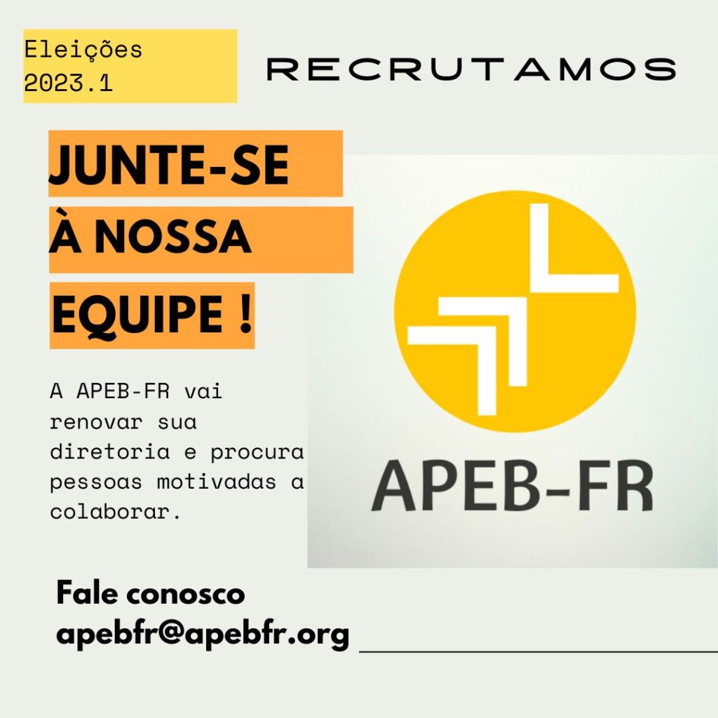 A APEB-FR recruta os interessados em participar da renovação do seu quadro de diretoria. Os interessados em fazer parte entrem em contato pelo email (apebfr@apebfr.org).