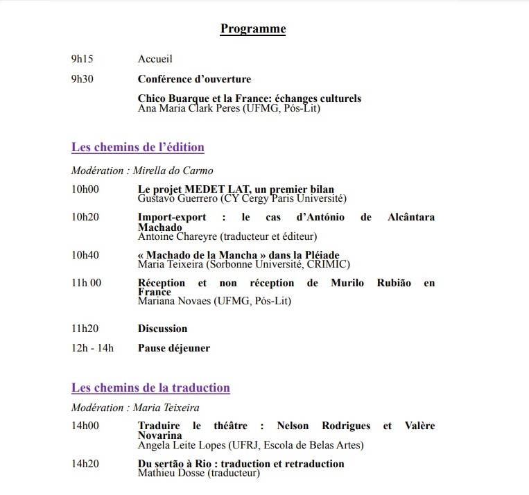 Cette journée d’études aura à cœur les circulations des textes littéraires et théâtraux entre le Brésil et la France, en mettant en examen les étapes d’édition, de médiation et de traduction en jeu dans ce processus.