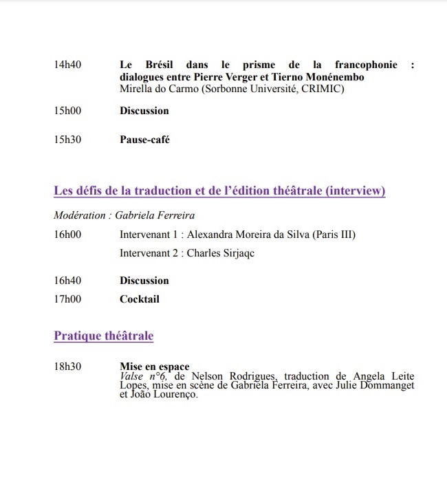 La journée sera suivie d’un cocktail et d’une lecture de la pièce Valse no 6, de Nelson Rodrigues, traduite par Angela Leite Lopes et mise en espace par Gabriela Ferreira, avec Julie Dommanget et João Lourenço.