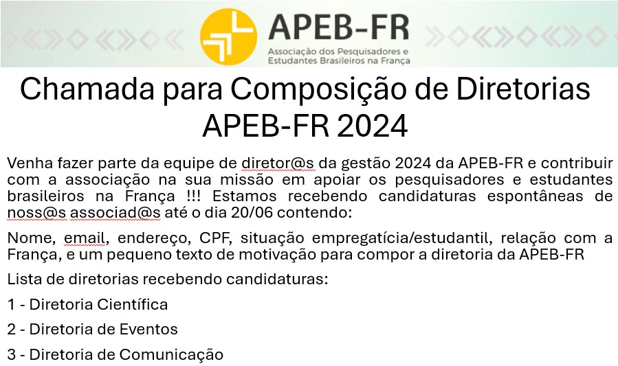 A candidatura deve ser enviada ao email presidente.apebfr@gmail.com contendo nome, email, endereço, CPF, situação empregatícia/estudantil, relação com a França, e um pequeno texto de motivação para compor a diretoria da APEB-FR. Somente associados em dia com as suas obrigações podem se candidatar (consultar Art. 7 do Estatuto). @ candidat@ declara verdadeiras as informações fornecidas, que serão utilizadas para a seleção d@s diretor@s.