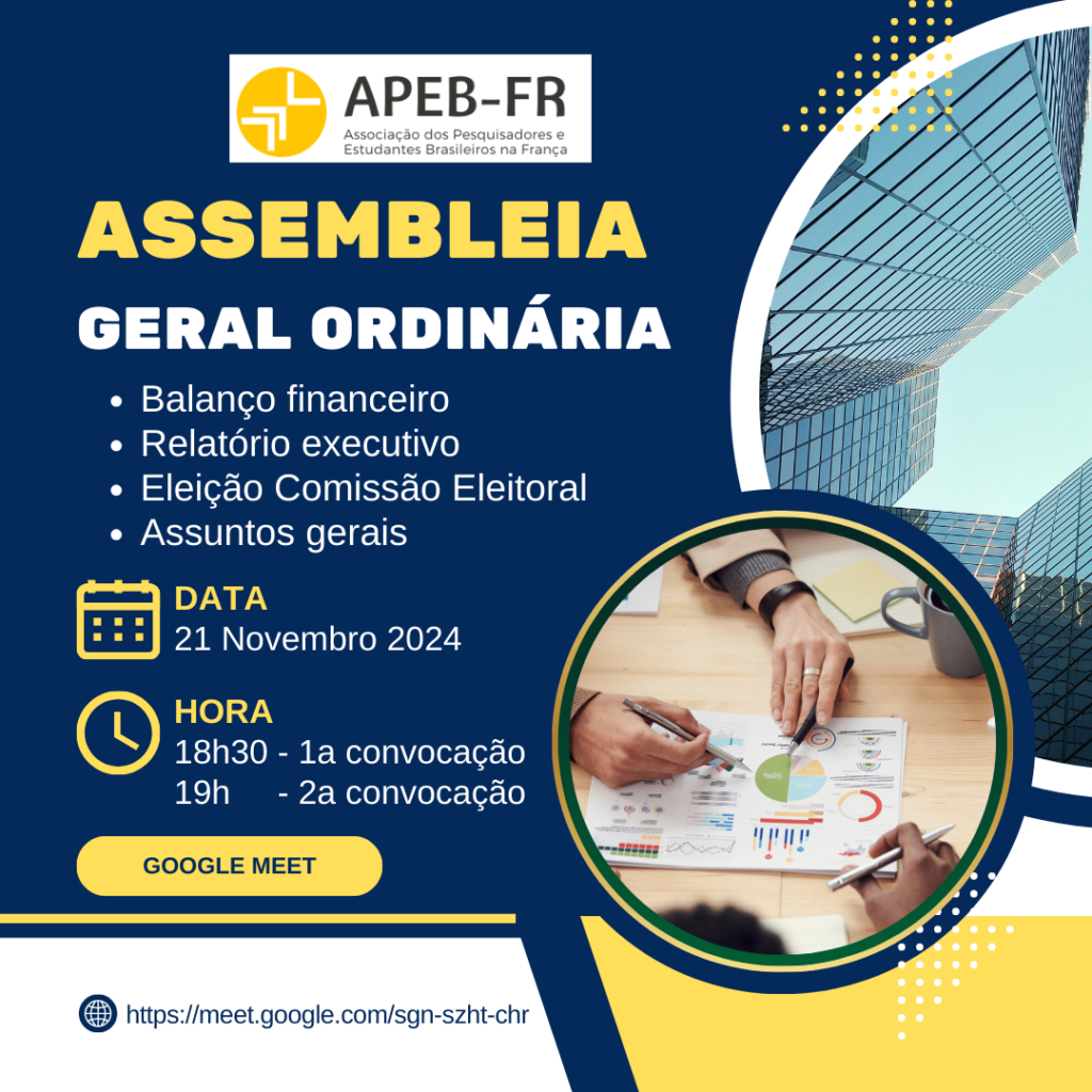 Na função de presidente em exercício , e seguindo o Art. 12 do atual Estatuto da APEB-FR, venho convoca-l@s para a Assembleia Geral 2024 da APEB-FR que acontecerá no dia 21 de novembro de 2024 às 18h30 em primeira convocação, passível de início com a presença de ⅓ dos associad@s com direito a voto, e às 19h em segunda convocação, iniciando-se nessa ocasião com qualquer quantidade de associad@s presentes, horário de Paris, França (GMT+1), de forma virtual através da plataforma Google Meets no link abaixo: